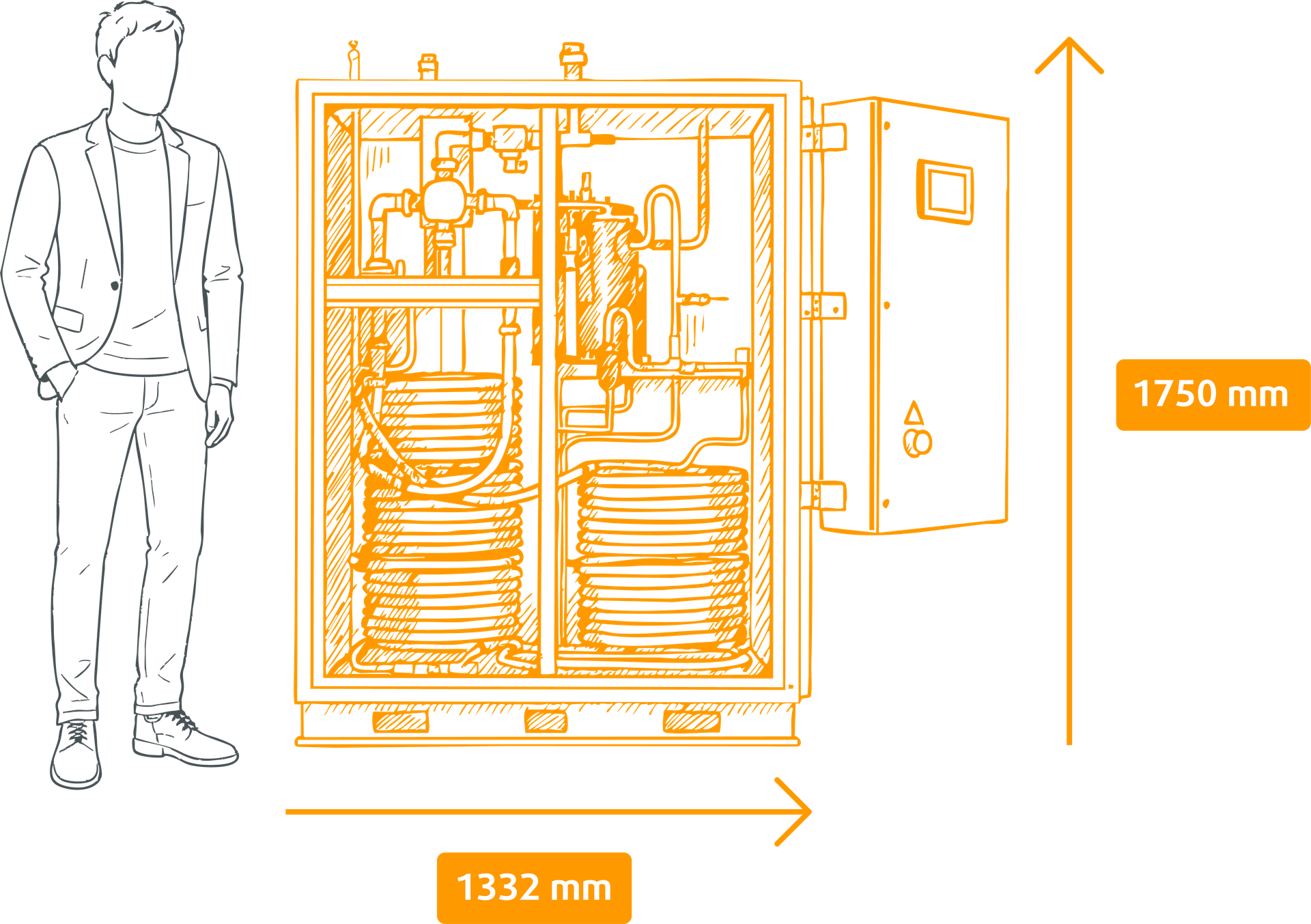 Con unas dimensiones de sólo 1,75 × 1,33 m, AquaCond cabe en casi cualquier sala de máquinas, independientemente del proyecto de construcción. Todas las variantes de rendimiento se basan en el mismo diseño compacto.